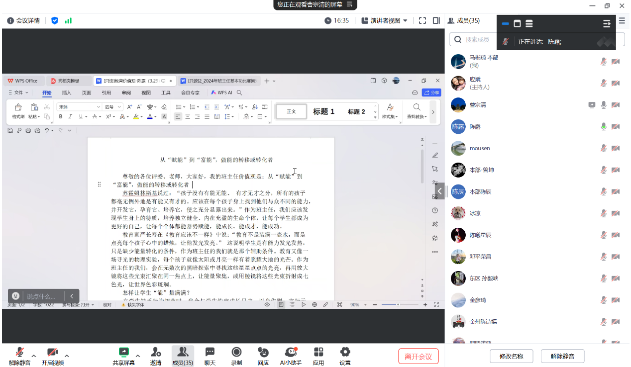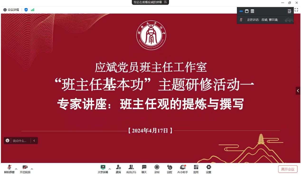 为积极备战班主任基本功大赛,以赛促研,切实提升工作室学员专业素养与育人能力,赋能工作室学员专业成长,4月17日,应斌党员班主任工作室举行第一次主题研修活动,工作室近30名学员与PA视讯曹宗清副教授就“班主任观提炼与撰写”主题开展“云端”对话。研修活动由工作室主持人应斌主持。